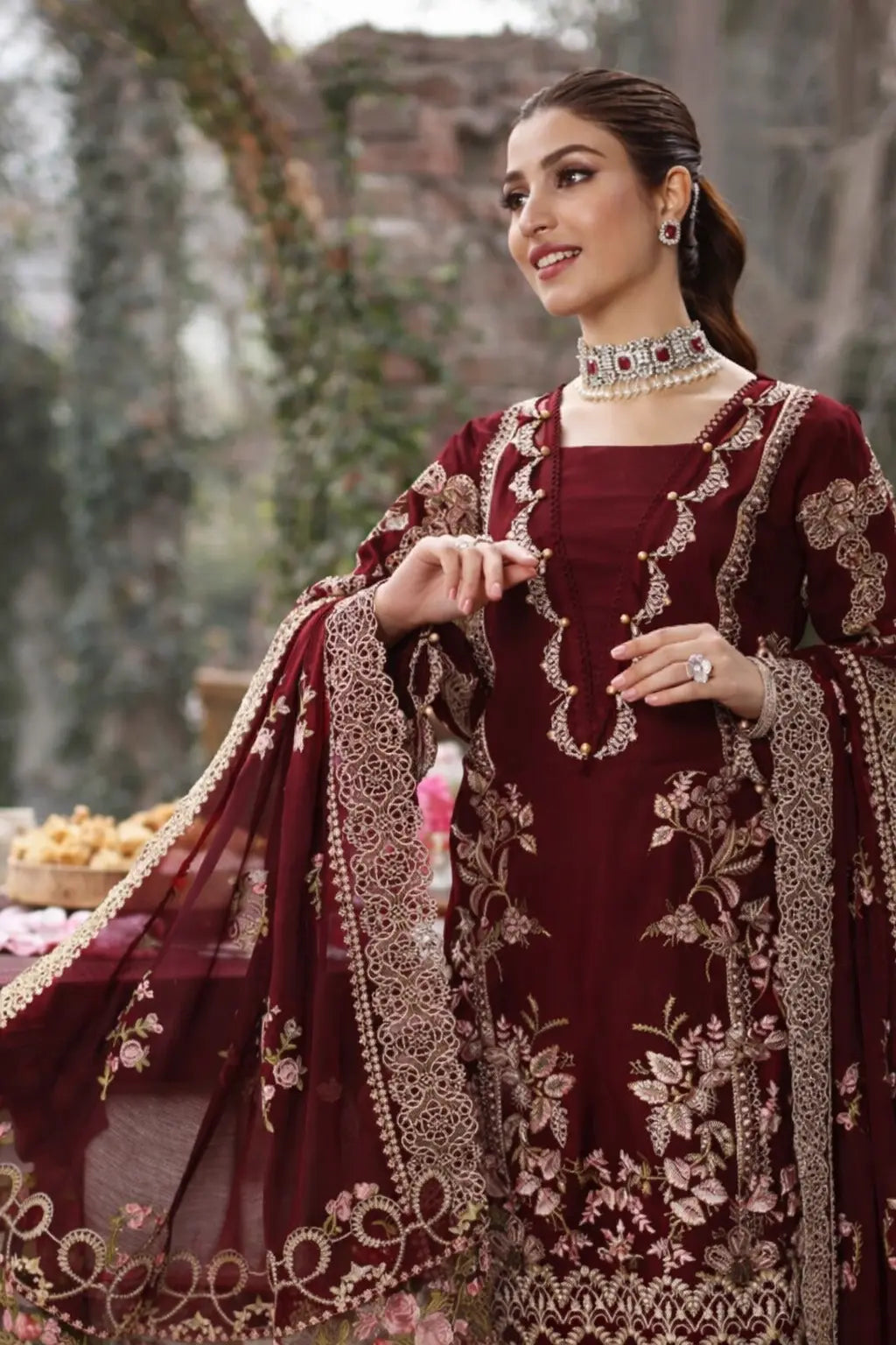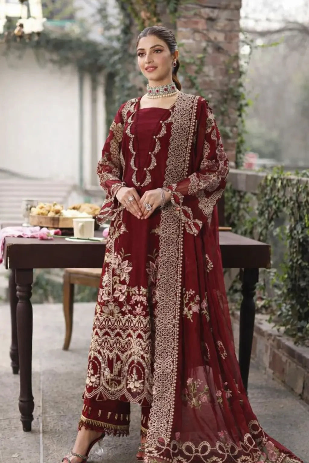Paired with an embroidered cotton net dupatta, finished with a heavily embroidered pallu, this ensemble offers a perfect balance of elegance and craftsmanship—ideal for festive occasions, formal gatherings, and statement winter wear.